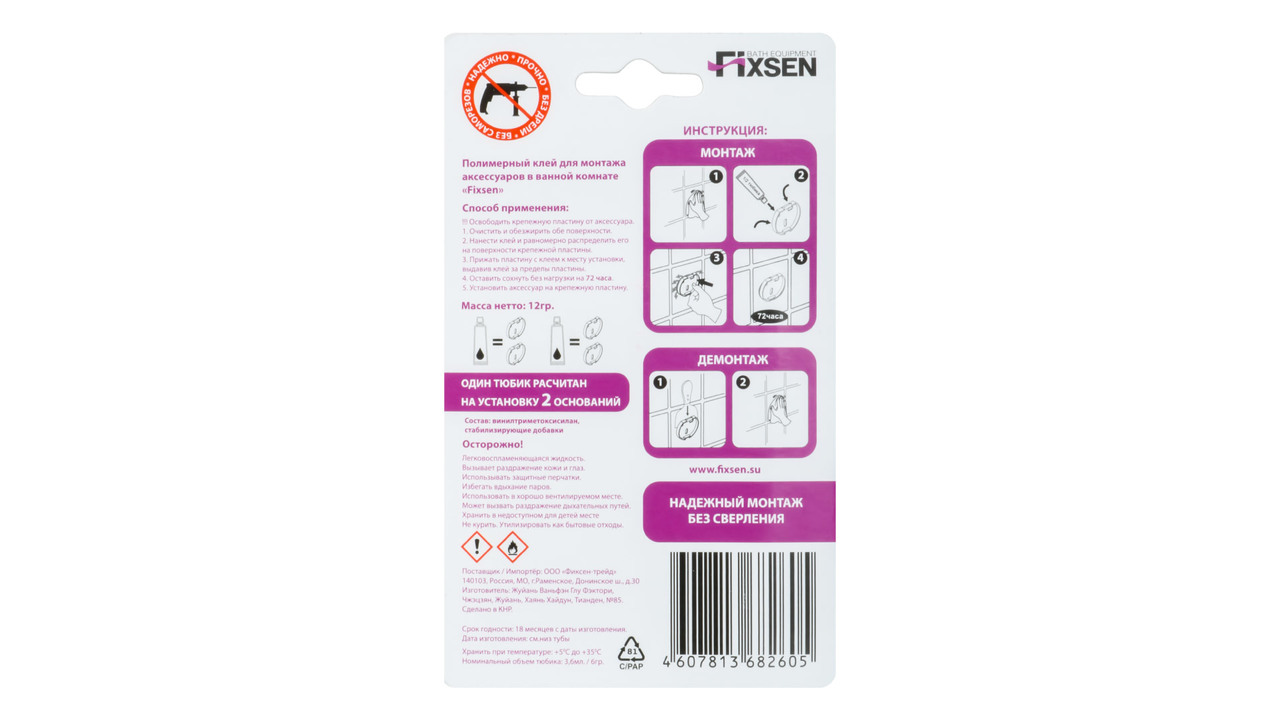 Клей Fixsen на базе полимеров MS обеспечивает надежный монтаж без сверления в помещениях с повышенной влажностью. Гарантирует исключительное сцепление с разными поверхностями: металлом, плиткой, камнем, стеклом и другими. Тюбик клея рассчитан на установку двух оснований, в упаковке 2 тюбика.