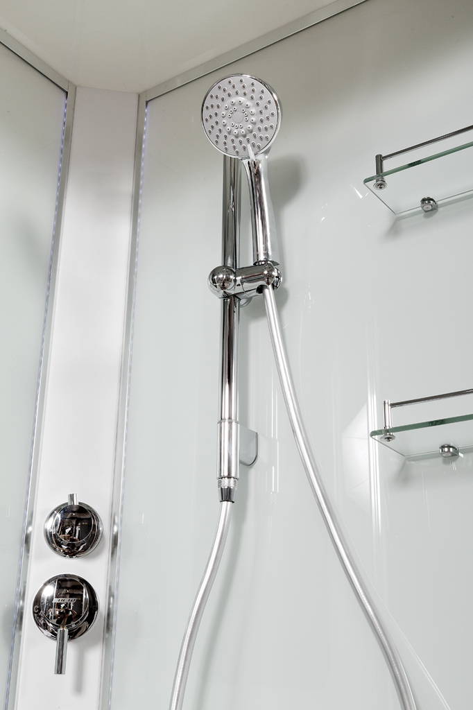 Комплектация: • Латунный смеситель с керамическими картриджами и резьбовыми соединениями • 100% акриловый поддон с дренажными отводами высотой 15 см, усиленный металлическим каркасом с антискользящим покрытием • Прозрачное безопасное закаленное сверхпрочное стекло толщиной 6 мм и антикальциевой обработкой • Душевая штанга с регулировкой лейки по высоте и ручная лейка с силиконовыми форсунками с функцией переключения режимов • Шланг 1,5 метра Anti-Twist (не скручивается). Поворот шланга 360°