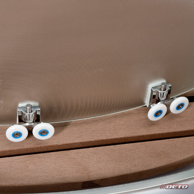 Комплектация: — антибактериальная пластиковая вставка (под дерево) в поддон; —без крыши; —монтаж без силикона; —резьбовые соединения всех шлангов; —усиленный акриловый поддон; —нескользящее покрытие поддона; —двойные металлические ролики (верхние и нижние) в пластиковом антикоррозийном кожухе; —крючок для мочалки; —штанга для ручного душа; —сифон с гидрозатвором