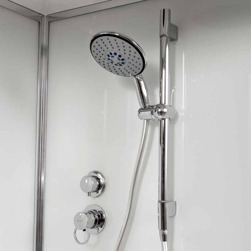 Комплектация: • Латунный смеситель с керамическими картриджами и резьбовыми соединениями • 100% акриловый поддон с дренажными отводами, высотой 27 см со съемным экраном усиленный металлическим каркасом с антискользящим покрытием • Матовое безопасное закаленное сверхпрочное стекло толщиной 4 мм и антикальциевой обработкой • Душевая штанга с регулировкой лейки по высоте и ручная лейка с силиконовыми форсунками диаметром 140 мм с функцией переключения режимов • Шланг 1,5 метра Anti-Twist (не скручивается). Поворот шланга 360°