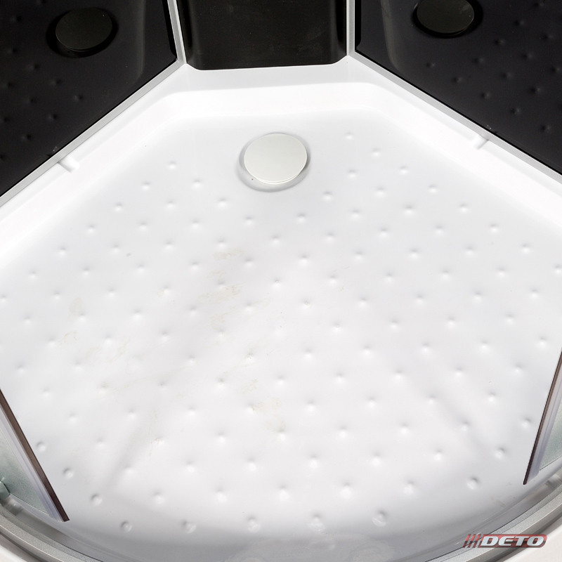 Комплектация: — вентиляционные отверстия в крыше; —крыша с тропическим душем и вентиляцией; —латунный смеситель с керамическими картриджами и резьбовыми соединениями; сверхпрочное стекло толщиной 4 мм с рисунком и антикальциевой обработкой; —хромированные ручки; —монтаж без силикона; —резьбовые соединения всех шлангов; —усиленный акриловый поддон с дренажными отводами; —нескользящее покрытие поддона; —бесшумные двойные ролики (верхние и нижние) в пластиковом антикоррозийном кожухе; —душевая лейка на штанге с силиконовыми форсунками; —шланг усиленный хромированный с системой ANTI-TWIST (не скручивается). Вращение шланга на 360⁰; —верхний и ручной душ оснащен системой Easy Clean; —сифон с гидрозатвором