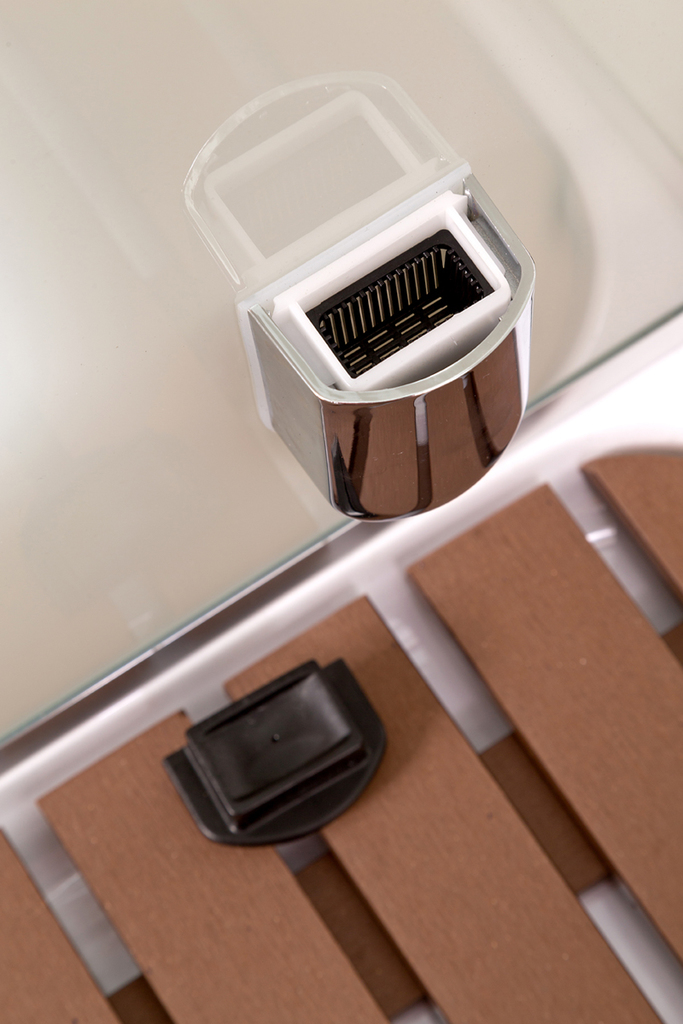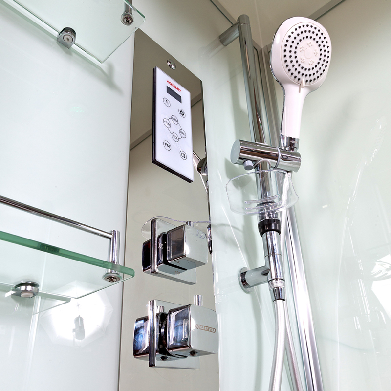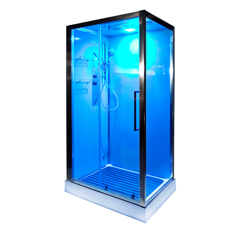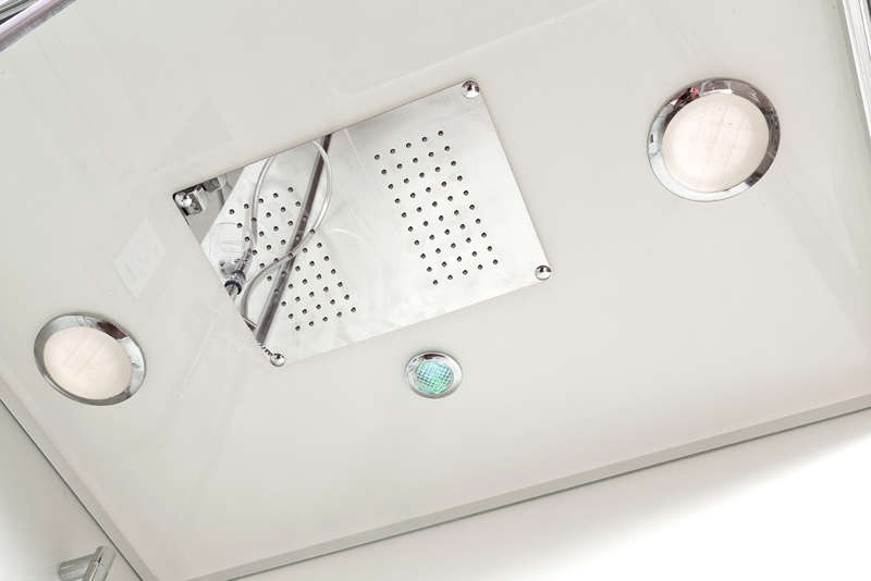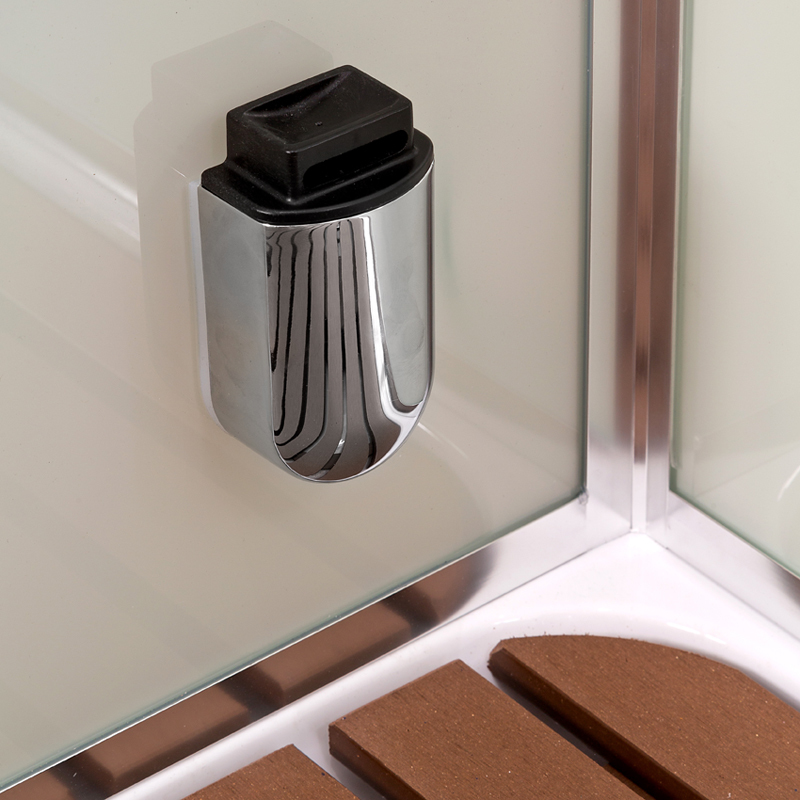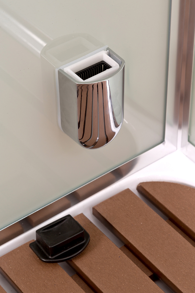 Комплектация: • Закаленные стекла толщиной 6 мм • Стеклянная крыша TRIPLEX толщиной 6 мм • Универсальное открывание дверей (возможность установки при монтаже как правого, так и левого открывания) • Два металлических ролика расположенных с внешней стороны двери (имеющие увеличенный срок службы благодаря отсутствию контакта с водой) • Акриловый поддон высотой 15 см, усиленный металлическим каркасом, выдерживающий нагрузку до 320 кг • Парогенератор с фитоконтейнером • Ручная лейка с силиконовыми самоочищающимися джетами и мыльницей на штанге • Сенсорный пульт управления: радио, светодиодная лампа с функцией хромотерапии, вентилятор • Антискользящая вставка из антибактериального полимера, имитирующего дерево (включена в стоимость душевой кабины) • Тропический душ с накладкой из нержавеющей стали с силиконовыми самоочищающимися джетами • Термостатический трехрежимный смеситель с керамическими кран-буксами • Две полки