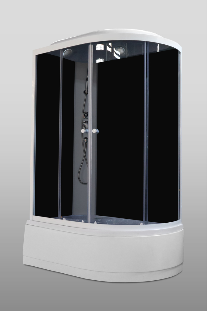 • Стекло: 4 мм, тонированное закаленное. • Стенки: закаленное черное стекло 4 мм. • Профиль: белый алюминиевый. • Поддон: высокий 42 см, асимметричный. • Комплектация: верхний душ тропик, ручной душ, сифон. • Магнитные уплотнители под 45°. • Соединение безболтовое. • Дополнительные силиконовые уплотнители для задних стенок.