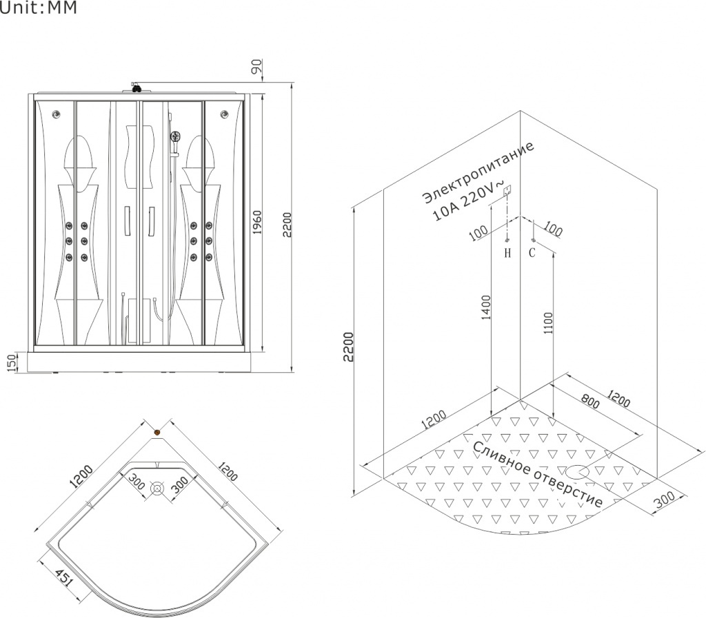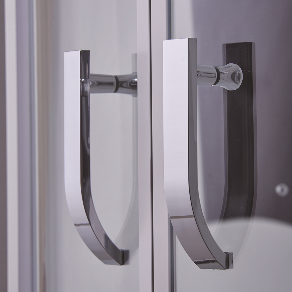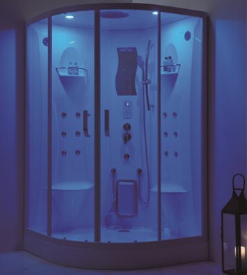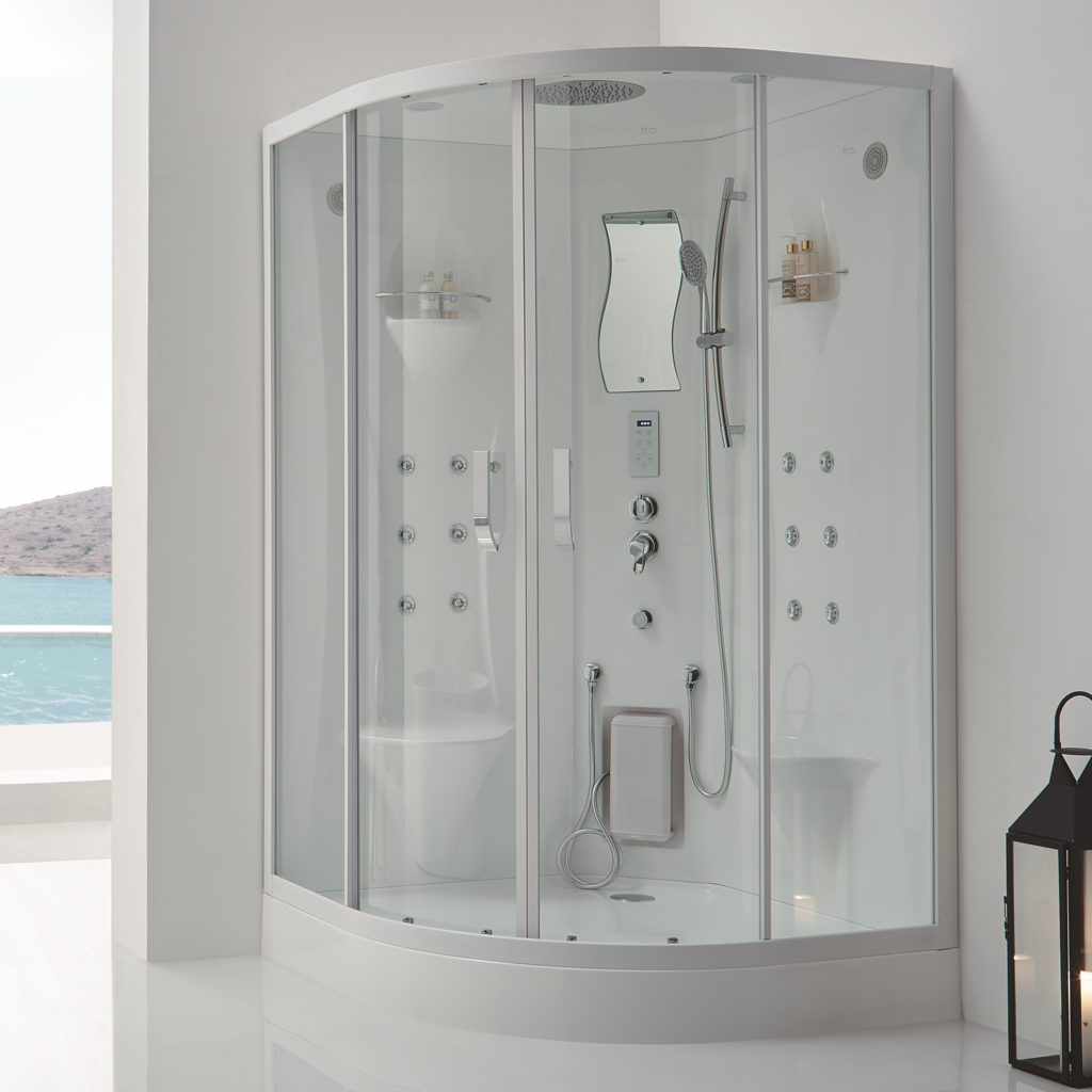 Комплектация: •Душевая кабина С ПАРОМ, с гидромассажем. • Панель управления S163BTC. • Озонатор. • FM радио + BLUETOOTH. • Низкий полукруглый поддон из 100% акрила с армировкой, высота - 150 мм. • Каркас из нерж. стали с регулируемыми ножками. • Задняя цельная панель из 100% акрила с полной армировкой и форсунками. • Крыша из 100% акрила с LED подсветкой. • Интегрированное в заднюю панель сиденье и полка с ограждением, зеркало. • Безсиликоновая сборка. • Закаленное стекло 6 мм, ручки из нерж. стали. • Профиль из алюминия с порошковой окраской белого цвета. • Верхний душ с силиконовыми форсунками антикальций. • Сифон с грязезащитной сеточкой. • Душевая лейка - шланг 1,5 м. • Смеситель из латуни с 3 режимами. • Ручки смесителя из латуни с хромировкой. • Усиленные двойные бесшумные ролики из металла. • Массажер ног. • 2 аудиодинамика, вытяжка.