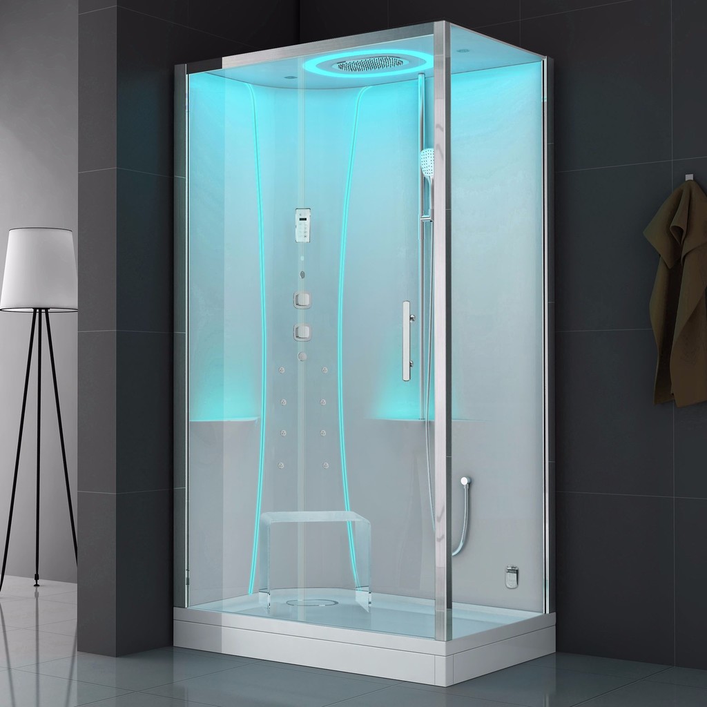 Комплектация: •Душевая кабина С ПАРОМ, с гидромассажем. • Панель управления S163BTC с подсветкой. • Озонатор. • FM радио + BLUETOOTH + телефон. • Парогенератор с таймером работы и автоматическим поддержанием температуры. • Термостат. • Низкий прямоугольный поддон из 100% акрила с армировкой. • Каркас из нерж. стали с регулируемыми ножками. • Легкосъемный экран из 100% акрила. • Задняя стенка из 100% акрила с армировкой и алюминиевыми форсунками. • Крыша из закаленного стекла с LED RGB подсветкой овальной формы. • Вертикальная двойная ленточная LED RGB подсветка по задней стенке. • Безсиликоновая сборка. • Дверь и боковые стенки - закаленное стекло 6 мм, ручка из нерж. стали. • Усиленные двойные бесшумные хромированные ролики. • Алюминиевый усиленный профиль (цвет по заказу - белый/глянцевое серебро). • Ультра-тонкий верхний душ из нерж. стали с силиконовыми форсунками антикальций. • Сифон с грязезащитной сеточкой. • Душевая лейка - шланг 1,5 м. • Смеситель из латуни с 3 режимами. • Ручки смесителя из латуни с хромировкой. • Вытяжка, 2 аудиодинамика. • Акриловая прозрачная табуретка. • Две полки, интегрированные в заднюю стенку. • Опция - трап из натурального дерева.