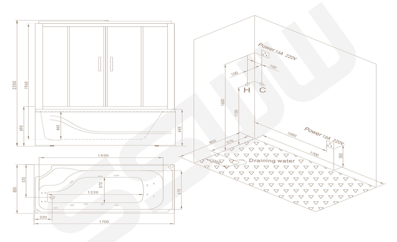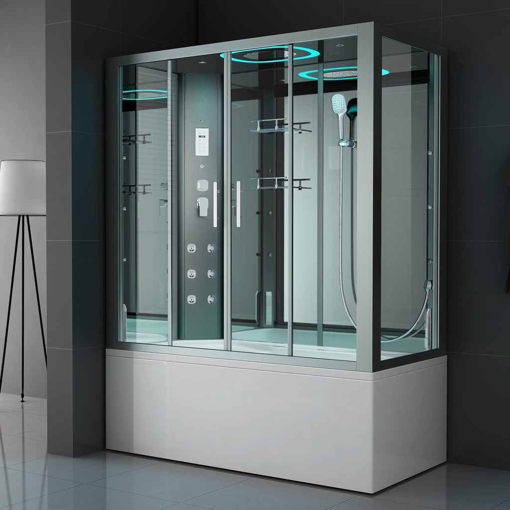 Комплектация: •Душевая кабина С ПАРОМ L/R, с гидромассажем. • Панель управления S163BT с подсветкой. • Озонатор. • FM радио + BLUETOOTH. • Парогенератор с таймером работы и автоматическим поддержанием температуры. • Термостат. • Глубокая прямоугольная ванна из 100% акрила с армировкой без гидромассажа. • Каркас из нерж. стали с регулируемыми ножками. • Цельный легкосъемный экран из 100% акрила. • Центральный столб и профиль из алюминия с матовым покрытием "голубой сапфир". • Большие гидромассажные форсунки из латуни на центральном столбе (6 штук). • Малые гидромассажные форсунки по бокам на профиле (6 штук). • Задние стенки из закаленного армированного взрывобезопасного стекла с термоизоляцией. • Крыша из закаленного стекла с LED RGB подсветкой овальной формы. • Фокусная потолочная LED лампа с декоративной отделкой из нерж. стали. • Безсиликоновая сборка. • Дверь и боковые стенки - закаленное серое стекло 6 мм, ручка из алюминия. • Усиленные двойные хромированные ролики из латуни. • Ультра-тонкий верхний душ из нерж. стали с силиконовыми форсунками антикальций. • Сифон с грязезащитной сеточкой и керамической декоративной крышкой. • Душевая лейка с 3 режимами - нескручивающийся шланг 1,5 м. • Смеситель из латуни с 4 режимами. • Хромированные ручки смесителя из латуни. • Вытяжка, 2 аудиодинамика (накладки из нерж. стали). • Двойная акриловая полочка. • Защита от протечек воды и сухого пуска. • Функция очистки парогенератора. • Подголовник из ППУ.