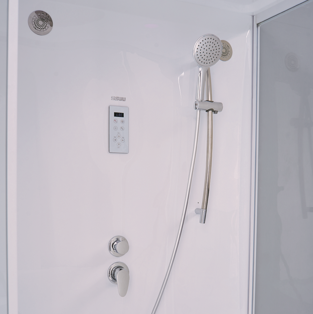 Комплектация: •Душевой бокс без пара L/R, с гидромассажем. • Панель управления S167BT. • FM радио + BLUETOOH. • Прямоугольная глубокая ванна из 100% акрила с армировкой, без гидромассажа. • Каркас из нерж. стали с регулируемыми ножками. • Задняя цельная панель из 100% акрила с полной армировкой и форсунками. • Крыша из 100% акрила с LED подсветкой. • Интегрированная в заднюю панель полка с ограждением, зеркало. • Безсиликоновая сборка. • Закаленное стекло 6 мм, металлические хромированные ручки. • Профиль из алюминия с порошковой окраской белого цвета. • Верхний душ с силиконовыми форсунками антикальций. • Сифон с грязезащитной сеточкой. • Душевая лейка - шланг 1,5 м. • Смеситель из латуни с 3 режимами. • Ручки смесителя из латуни с хромировкой. • Усиленные двойные бесшумные ролики из металла.