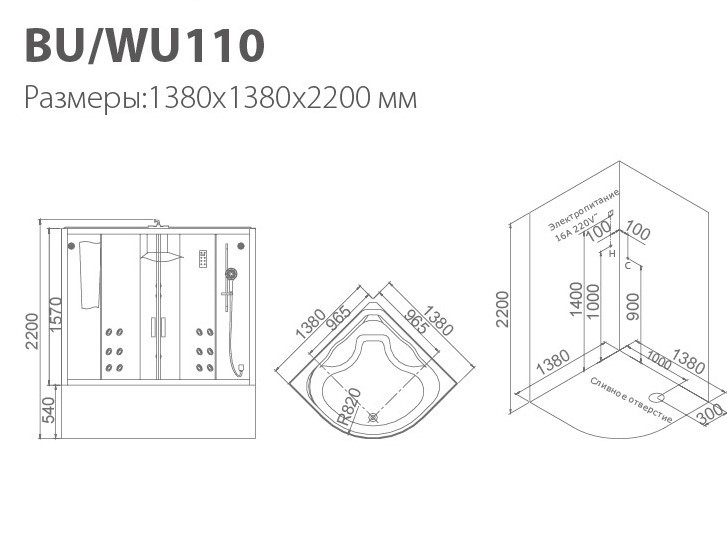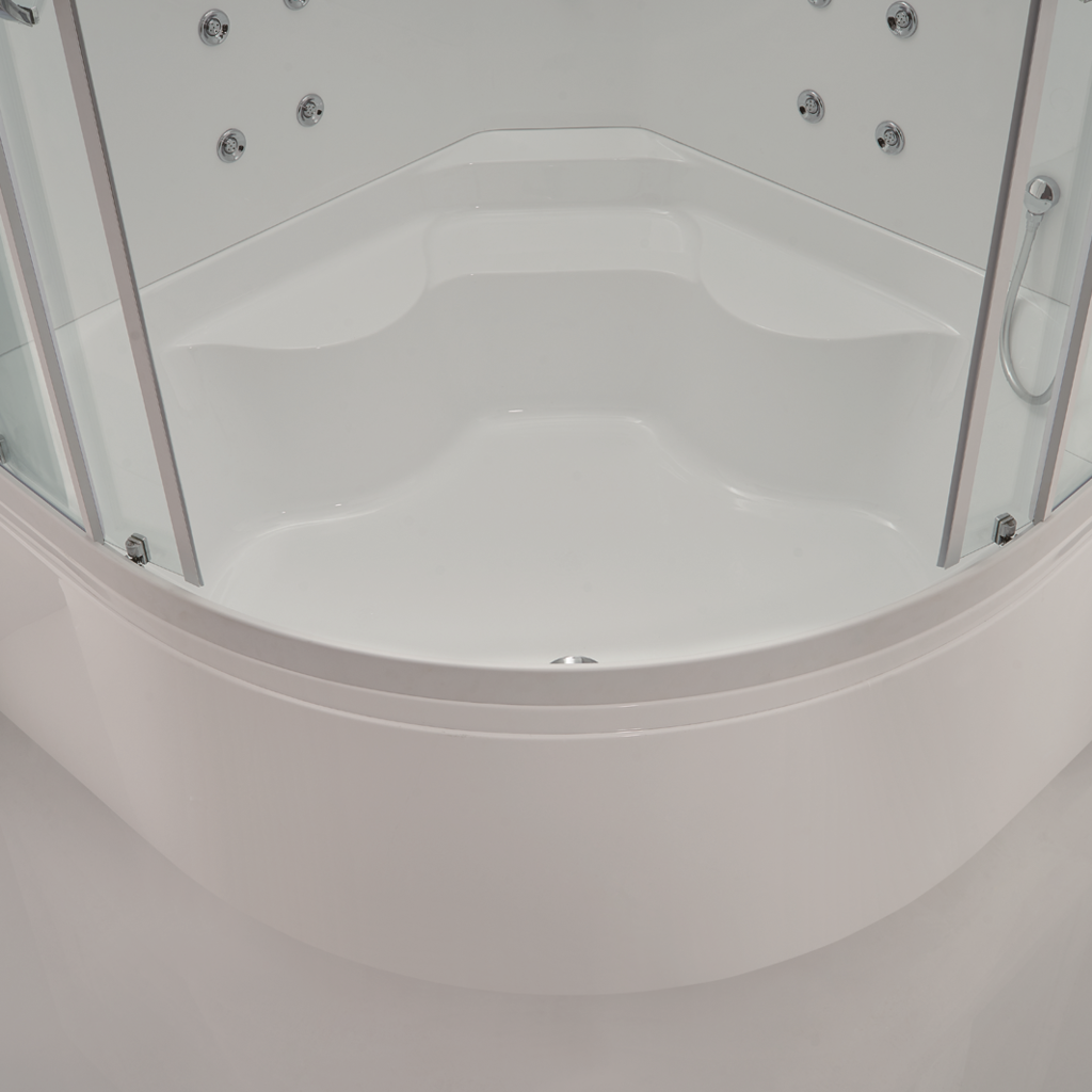 Комплектация: •Душевой бокс без пара, с гидромассажем. • Панель управления s167bt. • FM радио + Bluetooth. • Двухместная полукруглая глубокая ванна из 100% акрила с армировкой, без гидромассажа. • Каркас из нерж. стали с регулируемыми ножками. • Задняя цельная панель из 100% акрила с полной армировкой и форсунками на двух стенках. • Крыша из 100% акрила с led подсветкой. • Интегрированные в заднюю панель полка с ограждением и два сиденья, зеркало. • Безсиликоновая сборка. • Закаленное стекло 6 мм, металлические хромированные ручки. • Профиль из алюминия с порошковой окраской белого цвета. • Верхний душ с силиконовыми форсунками антикальций. • Сифон с грязезащитной сеточкой. • Душевая лейка - шланг 1,5 м. • Смеситель из латуни с 3 режимами. • Ручки смесителя из латуни с хромировкой. • Усиленные двойные бесшумные ролики из металла.