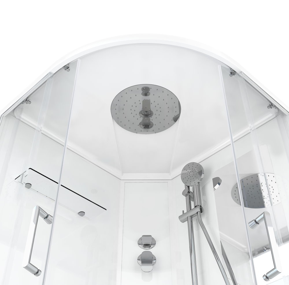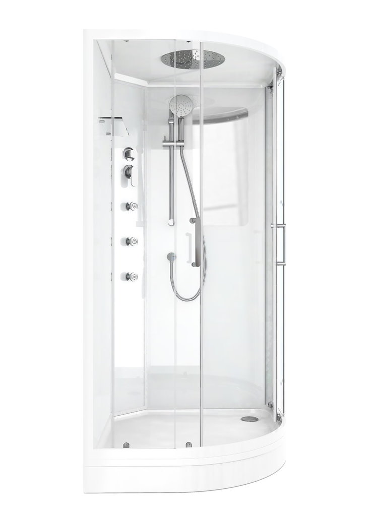 Акриловый поддон, стёкла белые AGC Planibel CrystalVision 6мм, тропический душ 30 см, 3 форсунки вертикального гидромассажа, смеситель с переключателем режимов, душевая стойка, 3-х режимная душевая лейка, стеклянная полочка 10х40 см, двойные подшипниковые ролики, встроенное зеркало 40х70см, выпуск с гидрозатвором и корзиной для сбора мусора, дверные ручки L=20 см, латунные резьбовые соединения, армированные соединительные шланги из полимерного композита, съёмный экран, стальное основание, 6 регулируемых ножек.