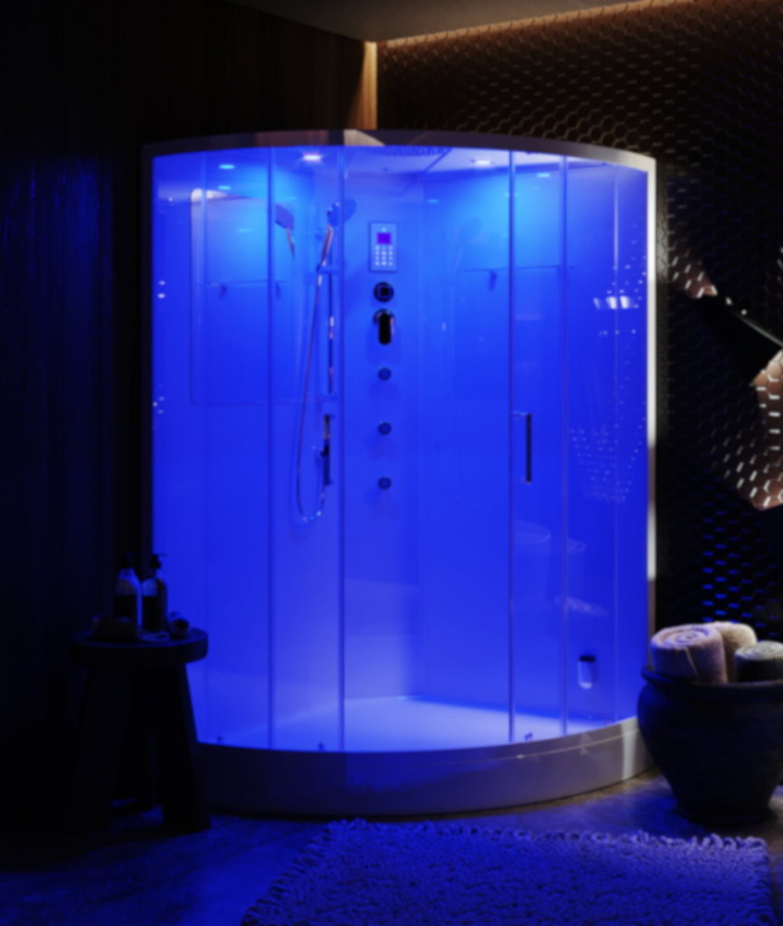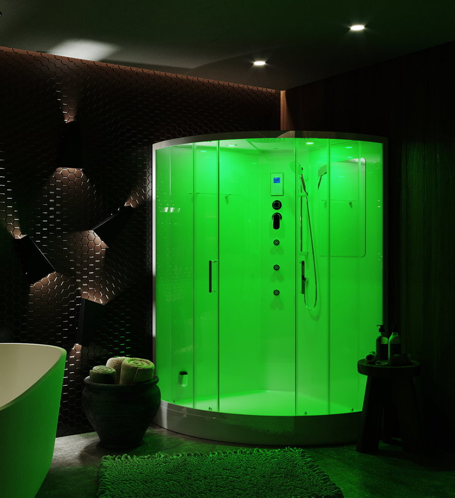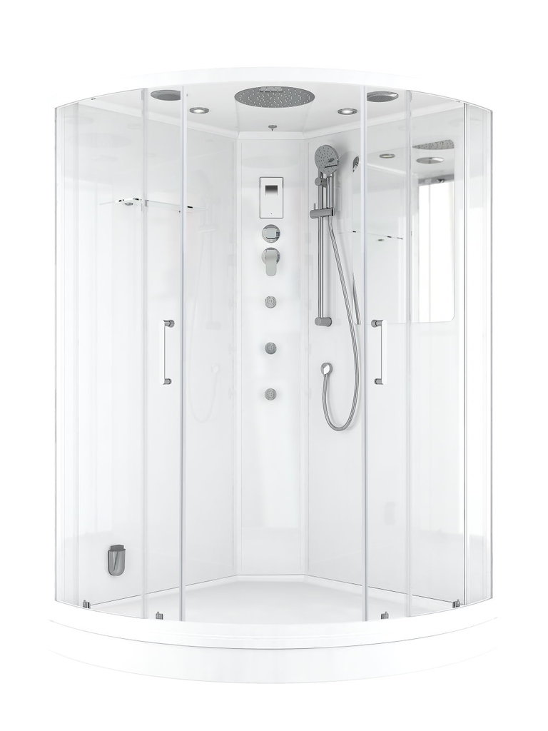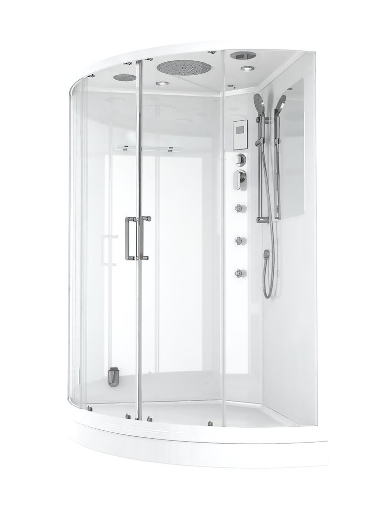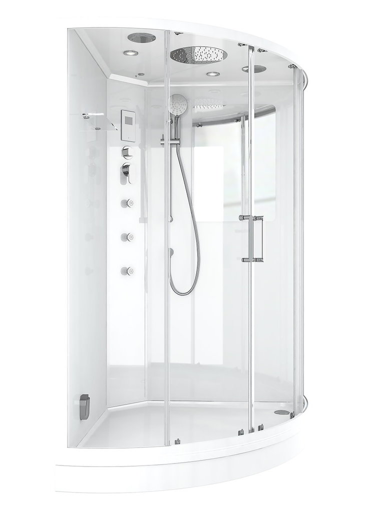 Турецкая баня 55оС, озонатор О3, сенсорная панель управления, акриловый поддон, стёкла белые AGC Planibel CrystalVision 6мм, тропический душ 30 см, 3 форсунки вертикального гидромассажа, смеситель с переключателем режимов, душевая стойка, 3-х режимная душевая лейка, стеклянная полочка 10х60 см, двойные подшипниковые ролики, выпуск с гидрозатвором и корзиной для сбора мусора, встроенное зеркало 50х70см, дверные ручки L=20 см, латунные резьбовые соединения, соединительные шланги из полимерного композита, съёмный экран, стальное основание, 7 регулируемых ножек, FM радио, BLUETOOTH музыка/телефон, вентиляция, многоцветная LED подсветка.