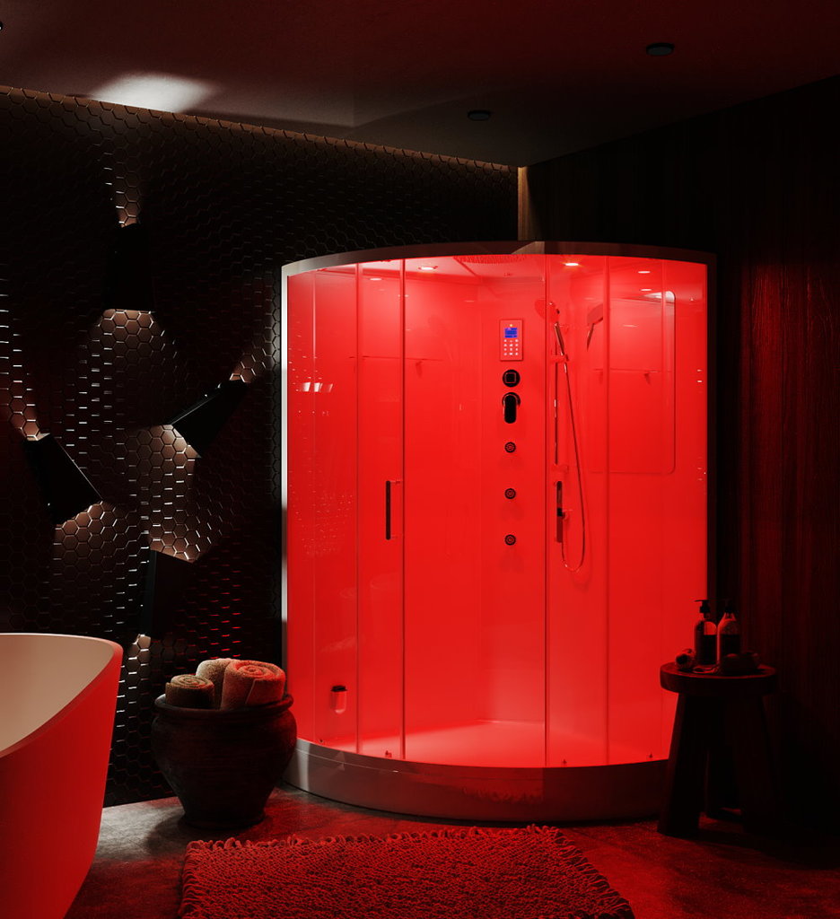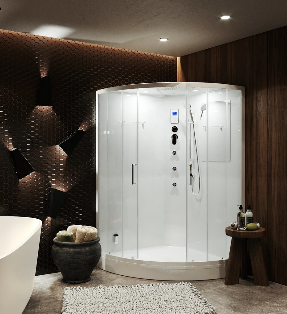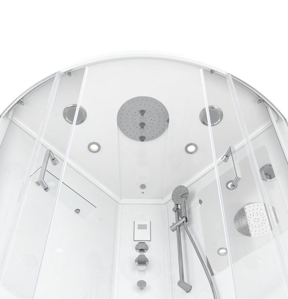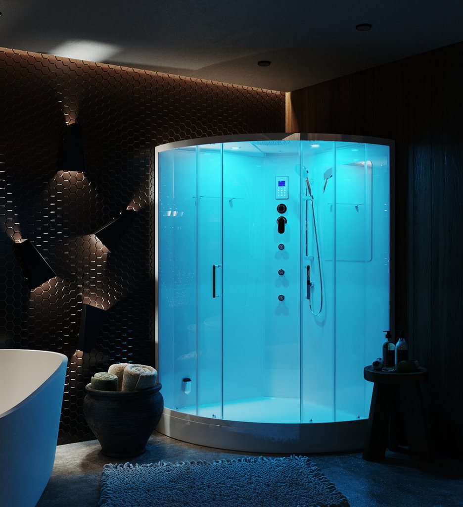 Турецкая баня 55оС, озонатор О3, сенсорная панель управления, акриловый поддон, стёкла белые AGC Planibel CrystalVision 6мм, тропический душ 30 см, 3 форсунки вертикального гидромассажа, смеситель с переключателем режимов, душевая стойка, 3-х режимная душевая лейка, стеклянная полочка 10х60 см, двойные подшипниковые ролики, выпуск с гидрозатвором и корзиной для сбора мусора, встроенное зеркало 50х70см, дверные ручки L=20 см, латунные резьбовые соединения, соединительные шланги из полимерного композита, съёмный экран, стальное основание, 7 регулируемых ножек, FM радио, BLUETOOTH музыка/телефон, вентиляция, многоцветная LED подсветка.