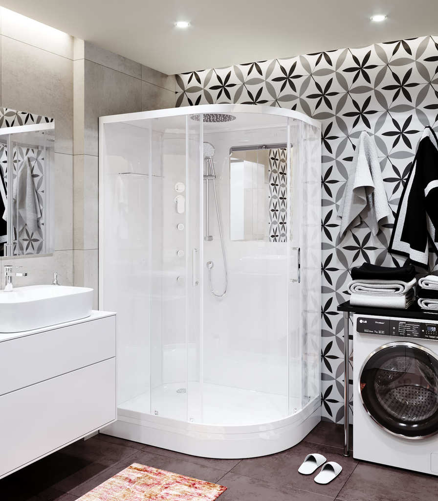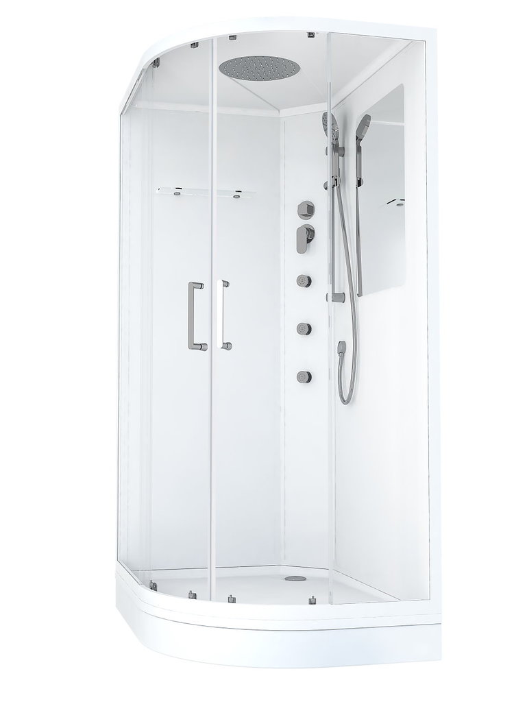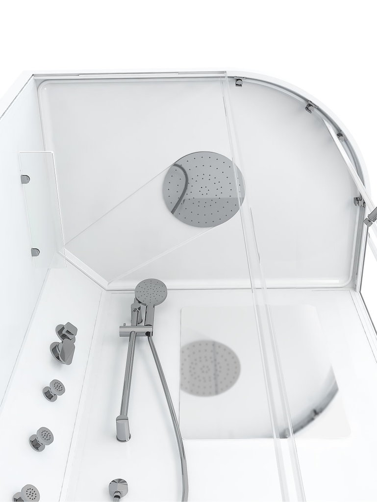 Акриловый поддон, стёкла белые AGC Planibel CrystalVision 6мм, тропический душ 30 см, 3 форсунки вертикального гидромассажа, смеситель с переключателем режимов, душевая стойка, 3-х режимная душевая лейка, стеклянная полочка 10х60 см, двойные подшипниковые ролики, встроенное зеркало 50х70см, выпуск с гидрозатвором и корзиной для сбора мусора, дверные ручки L=20 см, латунные резьбовые соединения, армированные соединительные шланги из полимерного композита, съёмный экран, стальное основание, 6 регулируемых ножек.