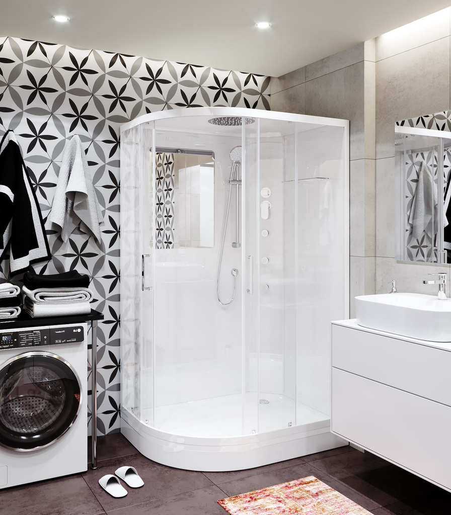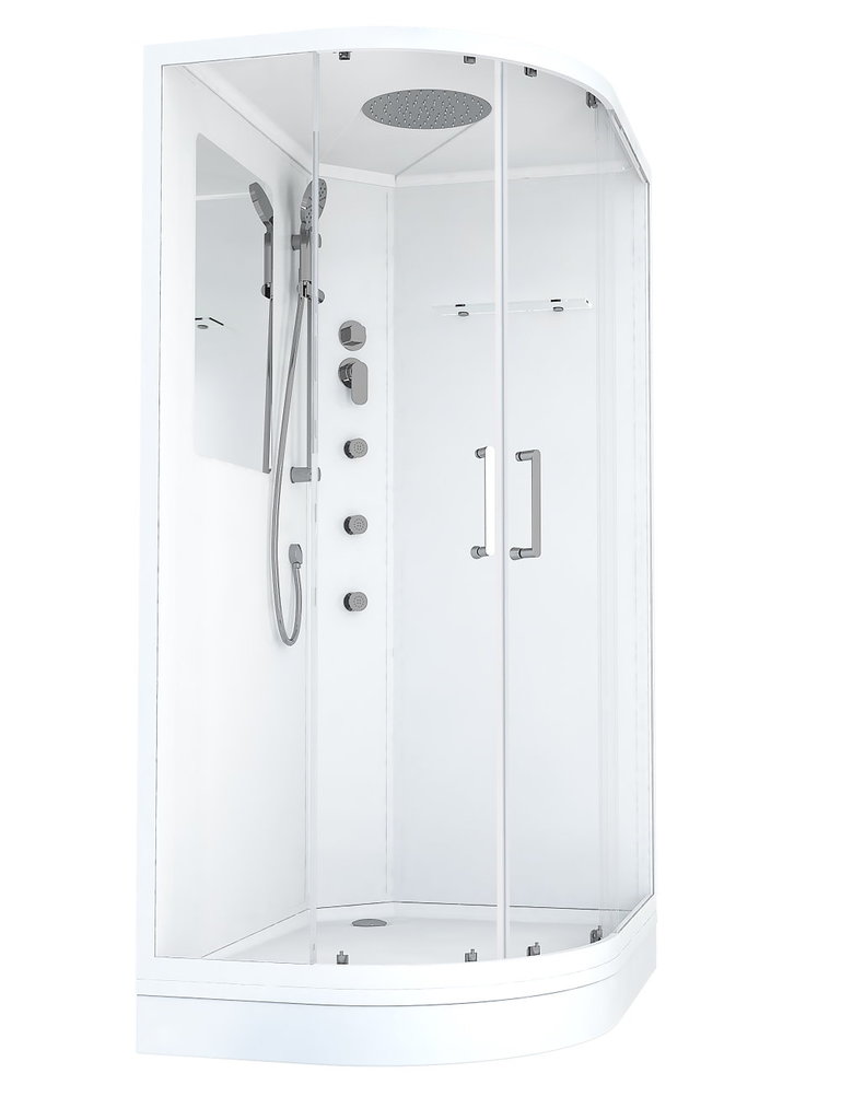 Акриловый поддон, стёкла белые AGC Planibel CrystalVision 6мм, тропический душ 30 см, 3 форсунки вертикального гидромассажа, смеситель с переключателем режимов, душевая стойка, 3-х режимная душевая лейка, стеклянная полочка 10х60 см, двойные подшипниковые ролики, встроенное зеркало 50х70см, выпуск с гидрозатвором и корзиной для сбора мусора, дверные ручки L=20 см, латунные резьбовые соединения, армированные соединительные шланги из полимерного композита, съёмный экран, стальное основание, 6 регулируемых ножек.