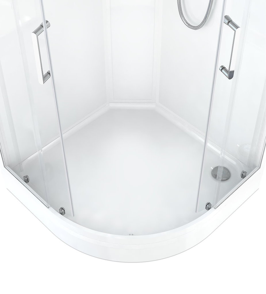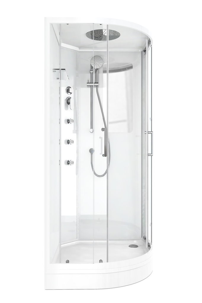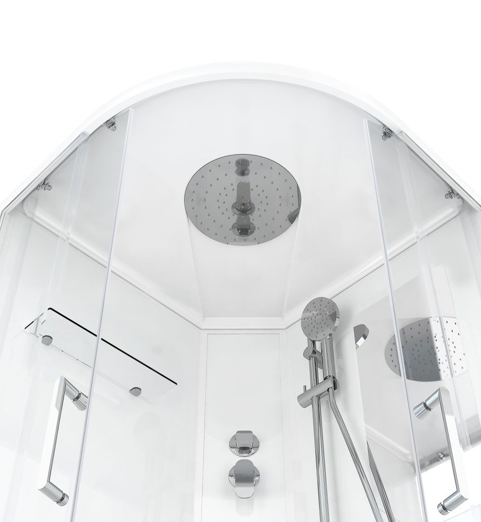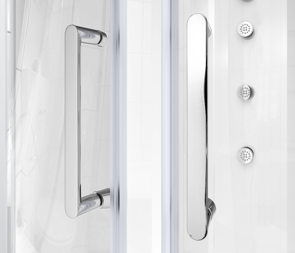 Акриловый поддон, стёкла белые AGC Planibel CrystalVision 6мм, тропический душ 30 см, 3 форсунки вертикального гидромассажа, смеситель с переключателем режимов, душевая стойка, 3-х режимная душевая лейка, стеклянная полочка 10х30 см, двойные подшипниковые ролики, встроенное зеркало 30х70см, выпуск с гидрозатвором и корзиной для сбора мусора, дверные ручки L=20 см, латунные резьбовые соединения, армированные соединительные шланги из полимерного композита, съёмный экран, стальное основание, 6 регулируемых ножек.