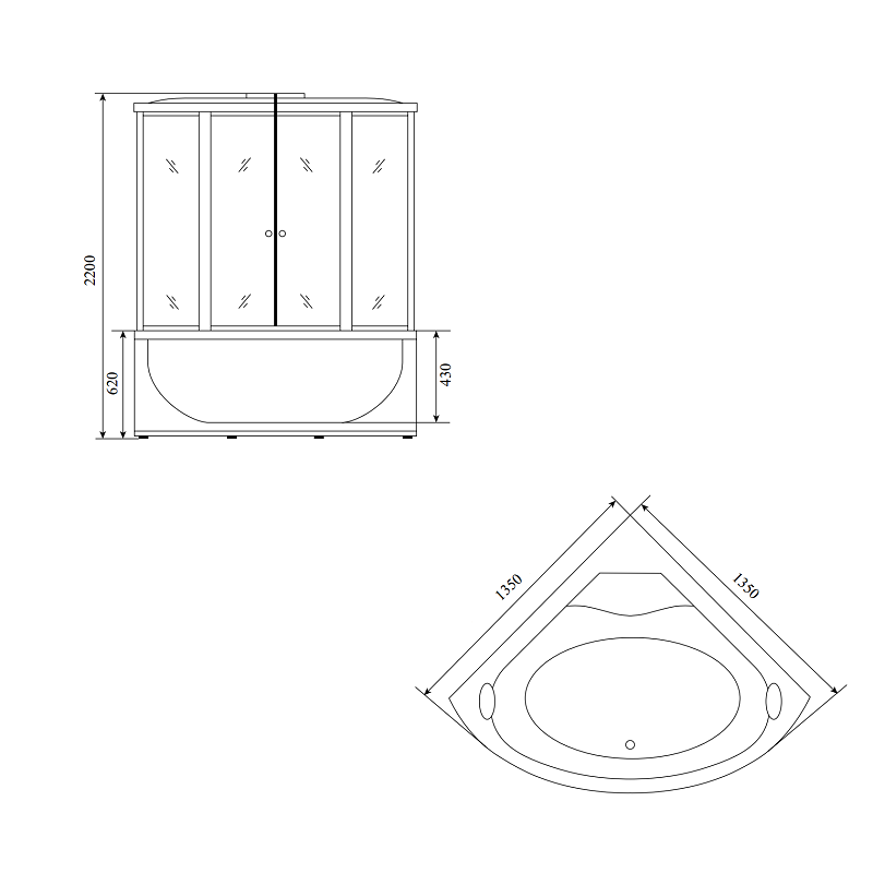 Комплектация: акриловая ванна высотой 55см со сливной системой clik-clak по центру ванны; три съемных экрана; алюминиевый профиль; закаленное стекло толщиной; двойные металлические ролики; сенсорный пульт нового поколения; FM-радио; верхняя и боковая подсветка; вентиляция; встроенный однорычажный смеситель 4-х режимный; лейка с гибким шлангом; гидромассаж спины 6 джет и излив для ванны; стеклянная полочка; диспенсер для геля и шампуня.