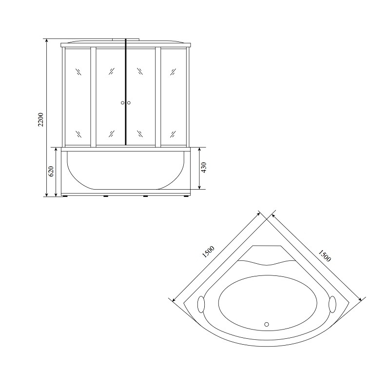 Комплектация: акриловая ванна высотой 55см со сливной системой clik-clak по центру ванны; три съемных экрана; алюминиевый профиль; закаленное стекло толщиной; двойные металлические ролики; сенсорный пульт нового поколения; FM-радио; верхняя и боковая подсветка; вентиляция; встроенный однорычажный смеситель 4-х режимный; лейка с гибким шлангом; гидромассаж спины 6 джет и излив для ванны; стеклянная полочка; диспенсер для геля и шампуня.