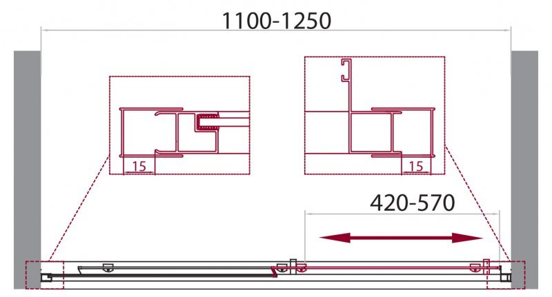 Дверь в проем с одной раздвижной секцией • Возможная установка: на поддон, на пол • Ориентация: универсальная • Материал полотна двери: закаленное стекло, стандарт EN12150-1:2000 • Материал профиля: анодированный алюминий, стандарт DIN17611 2007 • Регулировка ширины: предусмотрена за счет боковых профилей • Крепления полотна двери: двойные подшипниковые ролики • Поддон приобретается отдельно