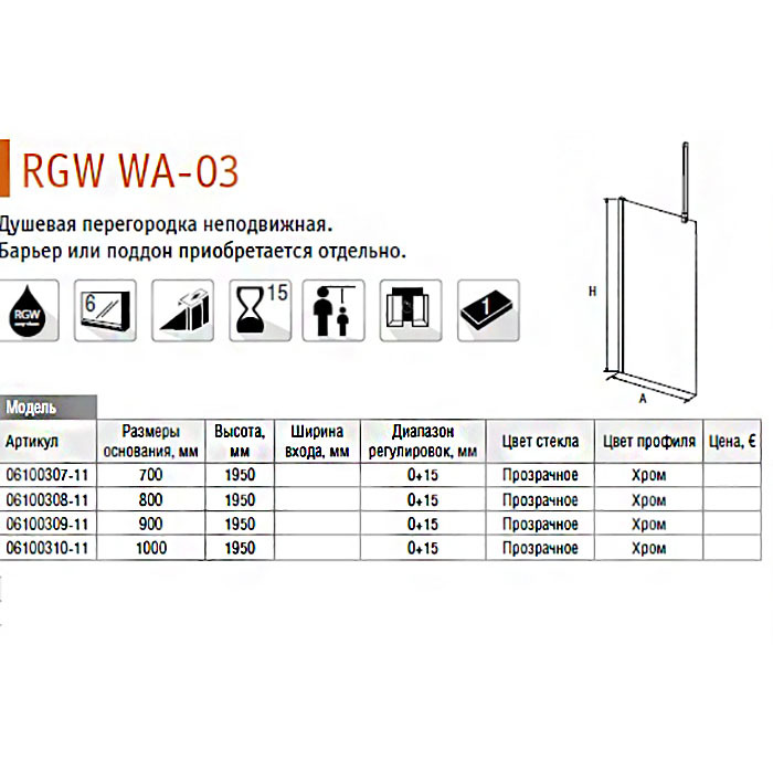 Немецкая фиксированные перегородка для душа RGW WA-03 100x195 - цена 24190 руб. Оформить заказ и купить душевую дверь RGW WA-03 100x195 в Москве в нашем интернет магазине можно по тел 8 (919) 991-95-00 или добавив товар в корзину.