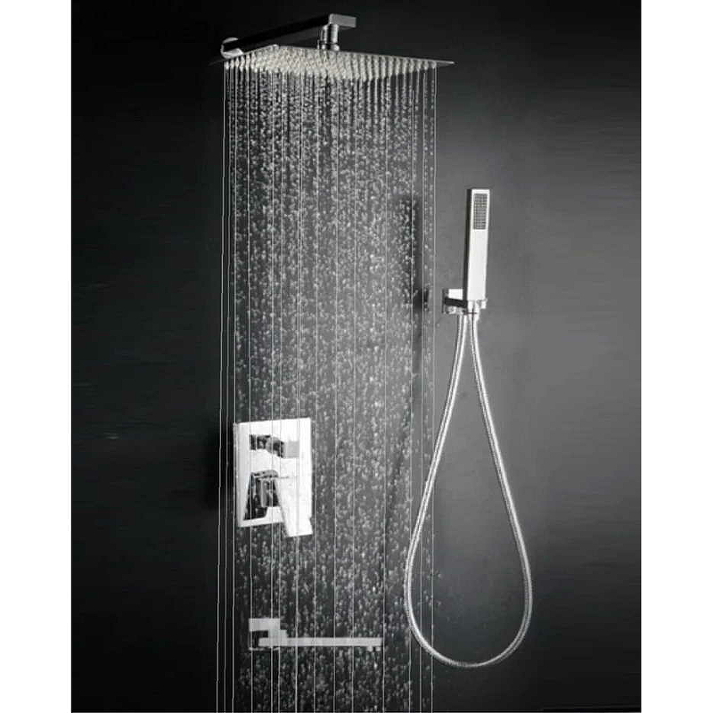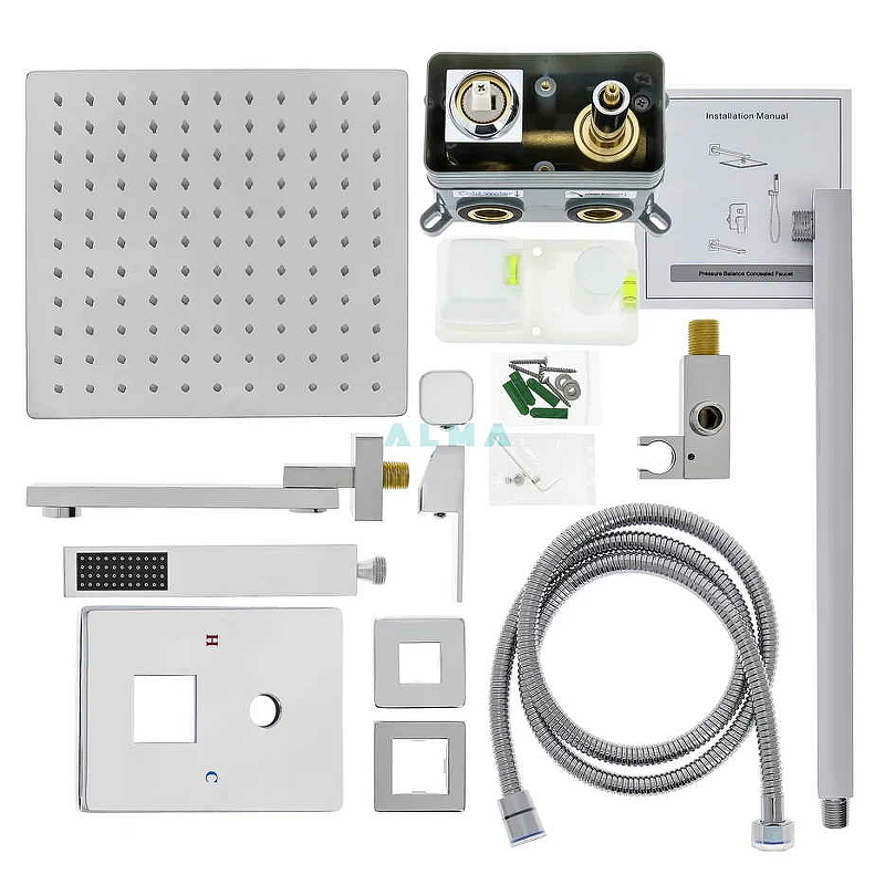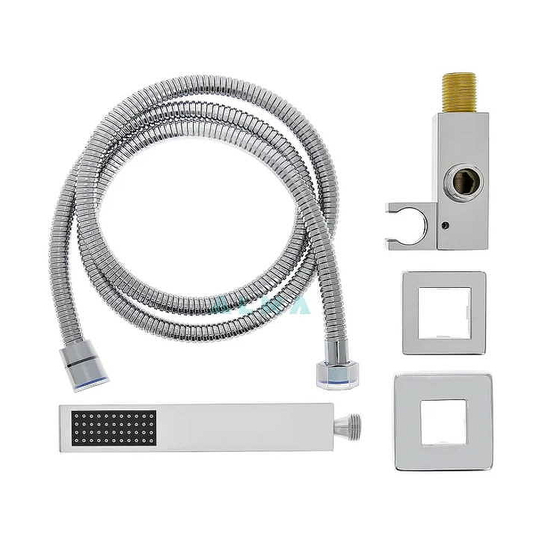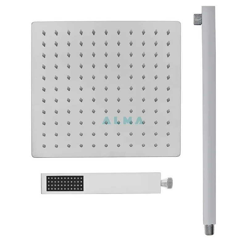 Излив поворотный латунь 24 см. Верхняя лейка нержавеющая сталь размер 25*25 см. Ручная лейка нержавеющая сталь. Длина верхнего кронштейна 40 см. Шланг 150 см. Встраиваемый смеситель латунь Глубина его погружения в стену 8 см.