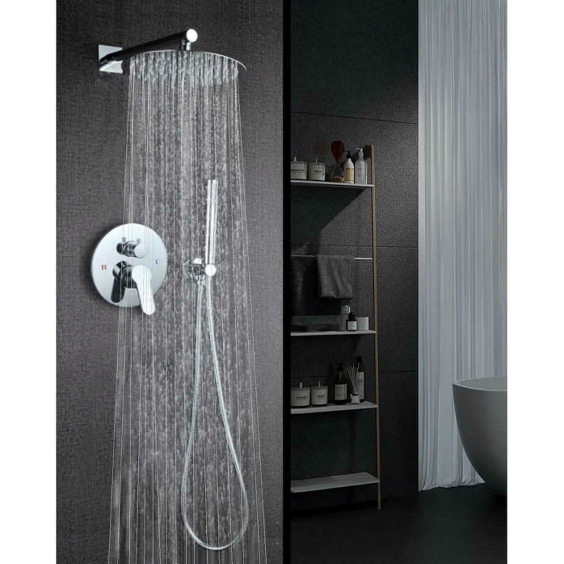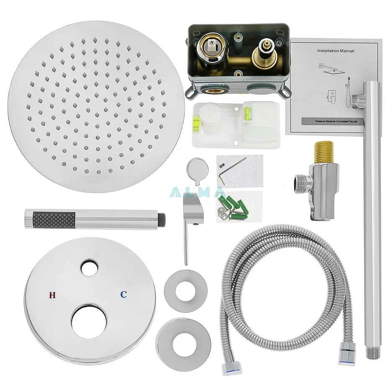 Верхняя лейка размер 25 см. Длина верхнего кронштейна 40 см. Шланг 150 см. Лейка ручная нержавеющая сталь. Встраиваемый смеситель латунь глубина его погружения в стену 8 см
