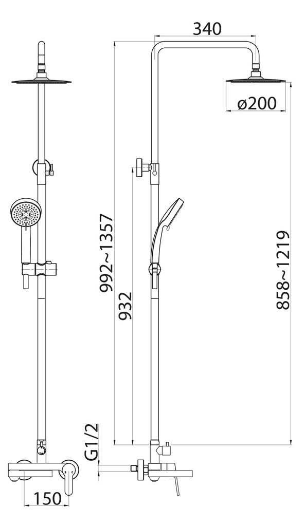 Душевая стойка с поворотным изливом, верхний душ (20 см, нержавеющая сталь), ручной душ, однорычажный смеситель.