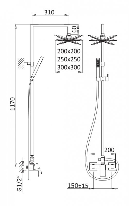 Комплектация: верхний душ 25 см, ручной душ, шланг, смеситель.