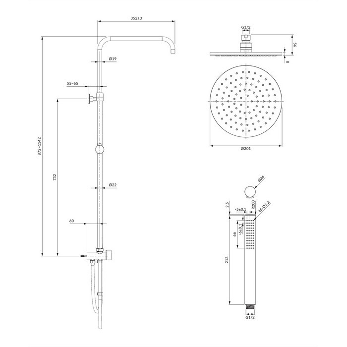 - душевая стойка (UN10042CR) с латунным переключателем и кронштейном для монтажа верхнего душа;