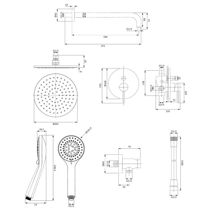 - верхний душ латунный (WG120CR), размер: ø20 см;