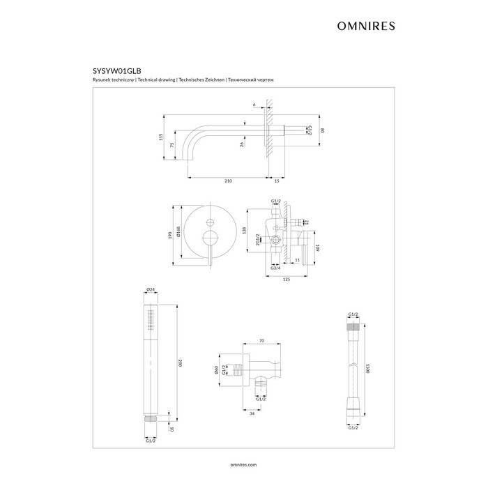 Душевая система Omnires для ванны скрытого монтажа брашированное золото - SYSYW01GLB