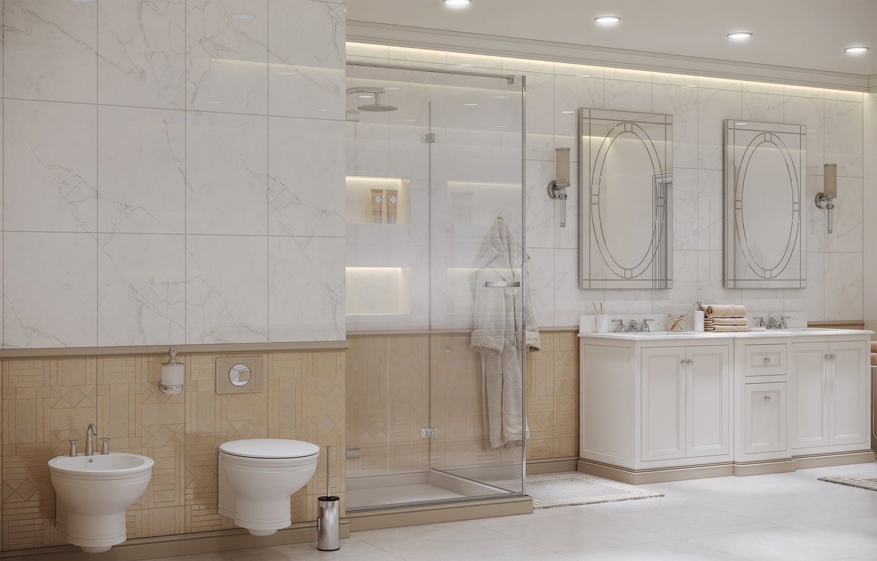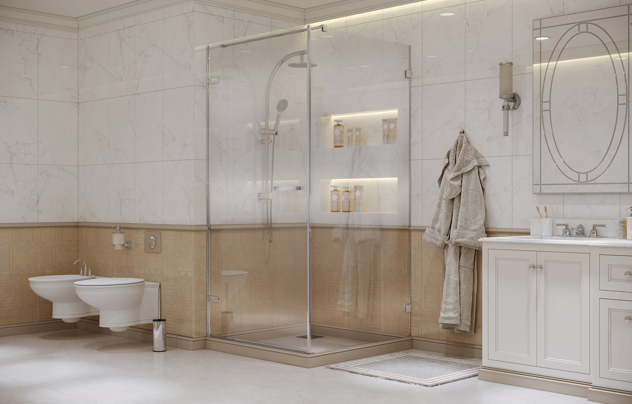 • Душевое ограждение устанавливается в облицованный керамической плиткой угол ванной комнаты.