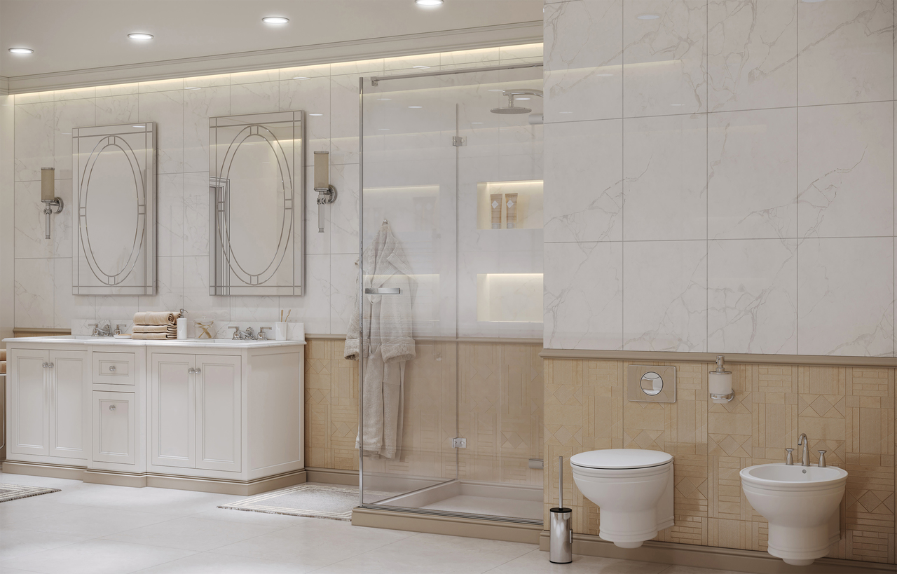 • Душевое ограждение устанавливается в облицованный керамической плиткой угол ванной комнаты.