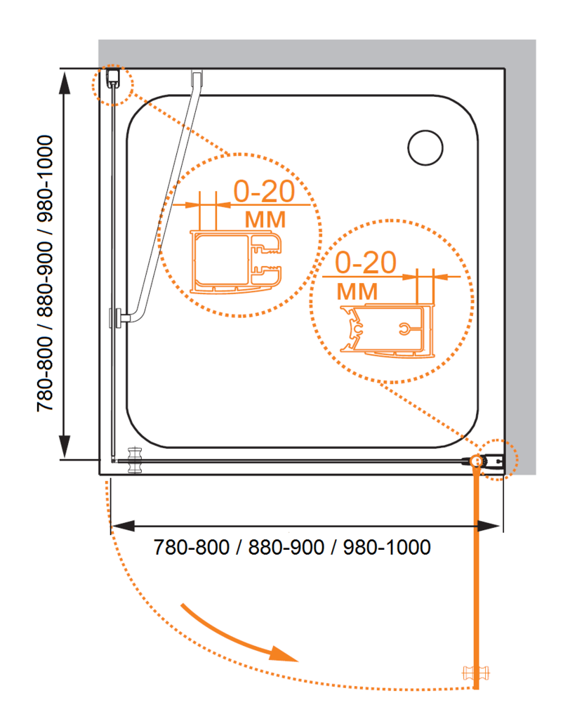 Душевой уголок, квадратный.Монтаж: пристенный в угол.Возможная установка: на поддон, на пол.Материал полотна двери: закаленное стекло, стандарт EN12150-1:2000Материал профиля: анодированный алюминий, стандарт DIN17611 2007.Регулировка ширины: предусмотрена за счет боковых профилей.Крепления полотна двери: цилиндрическая петля с подъемным механизмом.Дополнительная информация: поддон приобретается отдельно.Ресурс эксплуатации: 15 лет