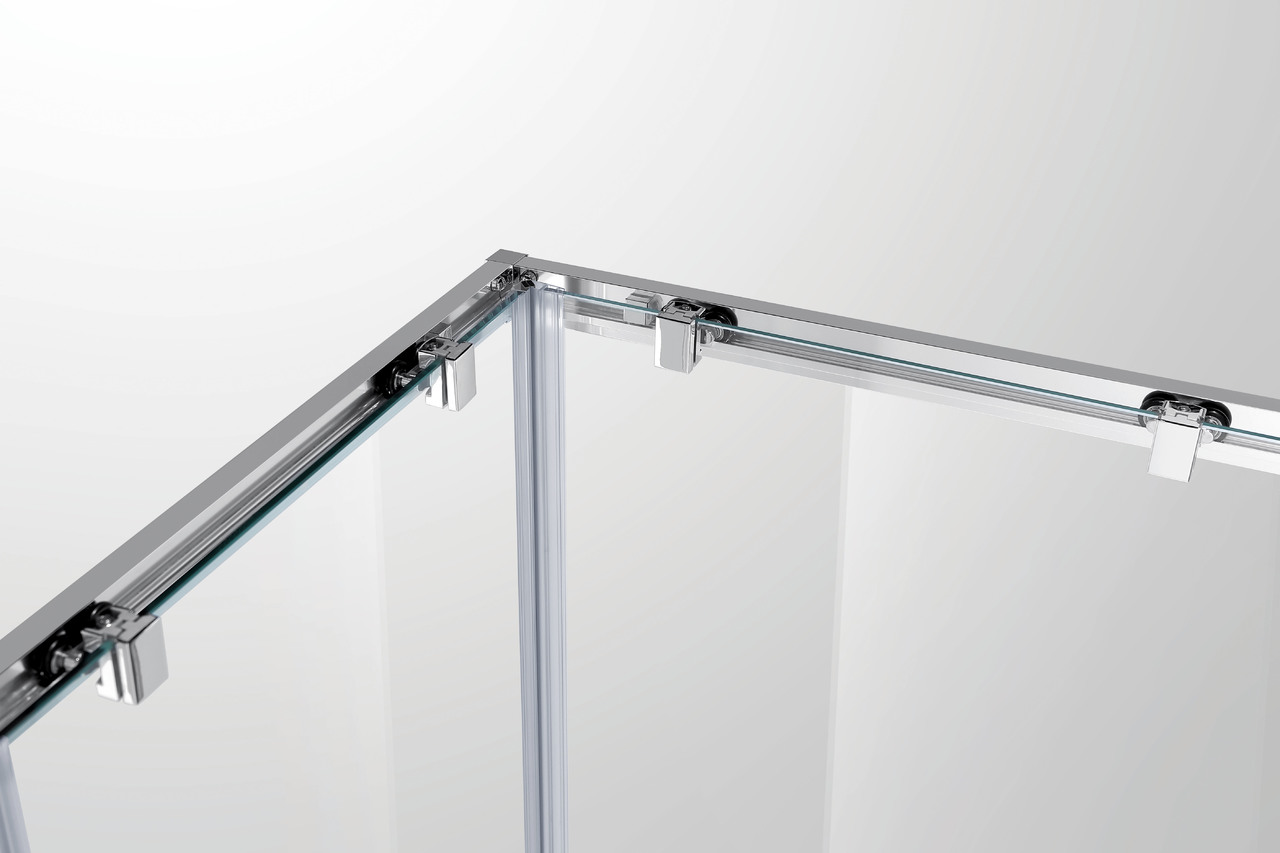 Душевой уголок,регулировка ширины предусмотрена за счет боковых профилей.Крепления полотна двери: двойные подшипниковые ролики.Ресурс эксплуатации 15 лет.