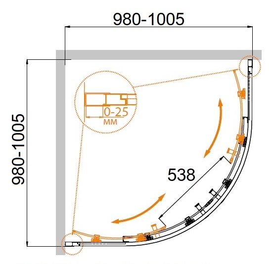Душевой уголок,регулировка ширины предусмотрена за счет боковых профилей.Крепления полотна двери: двойные подшипниковые ролики.Модельный ряд с антикальциевой обработкой (IDROREPELLENTE VETRO-IV).Ресурс эксплуатации 15 лет.