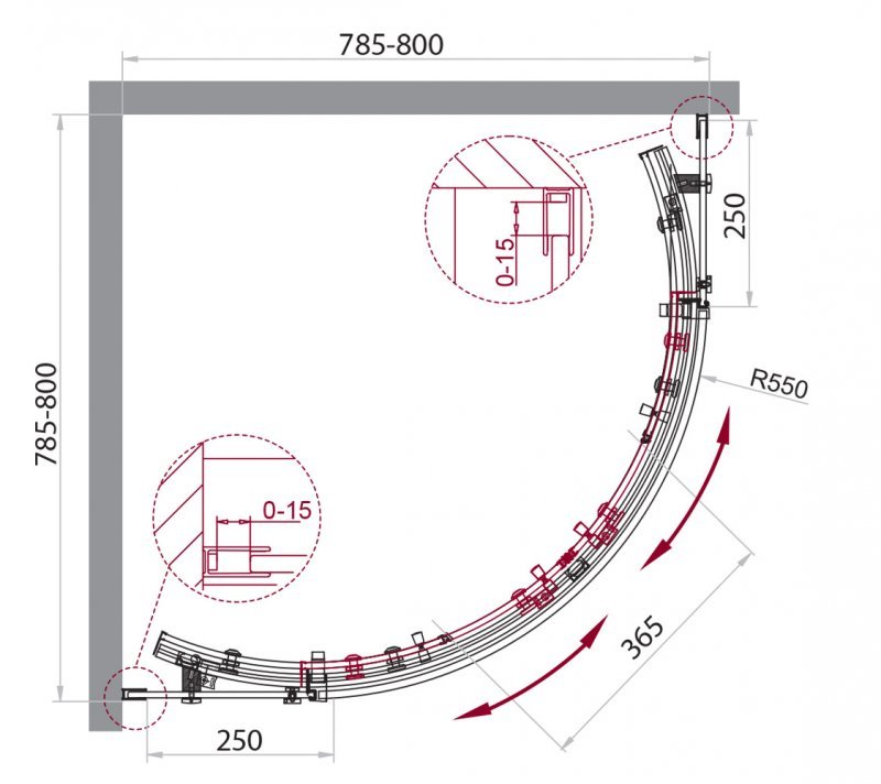 Душевой уголок четверть круга • Две раздвижные двери. • Ориентация: универсальная. • Материал полотна двери: закаленное стекло. • Несущий профиль из нержавеющей стали. • Регулировка ширины предусмотрена за счет боковых профилей. • Крепления полотна двери: двойные ролики. • Поддон приобретается отдельно.