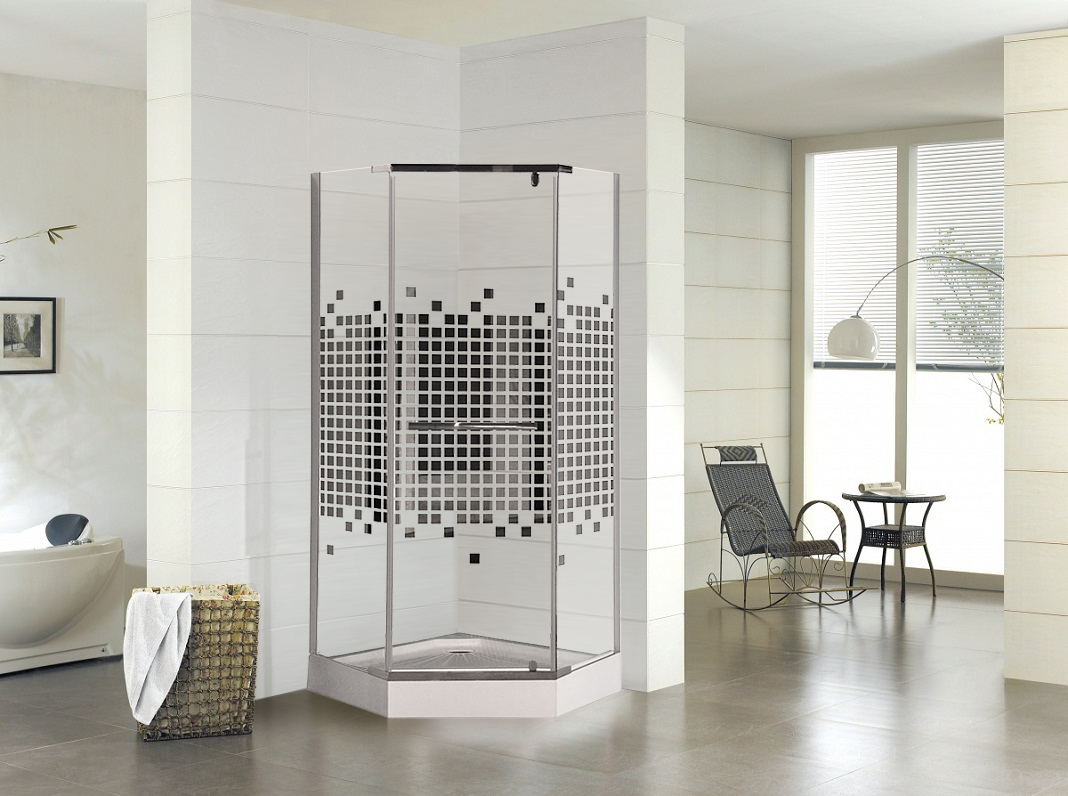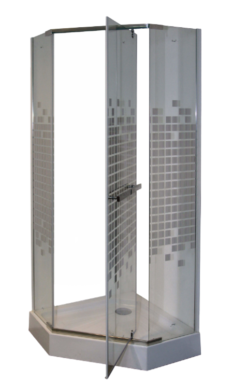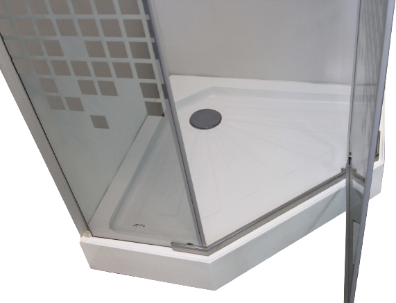 Компактный уголок в форме трапеции экономит полезную площадь в ванной комнате. Двусторонний зеркальный рисунок Mosaico» скрывает человека внутри душевой зоны и придает уголку стильный внешний вид.