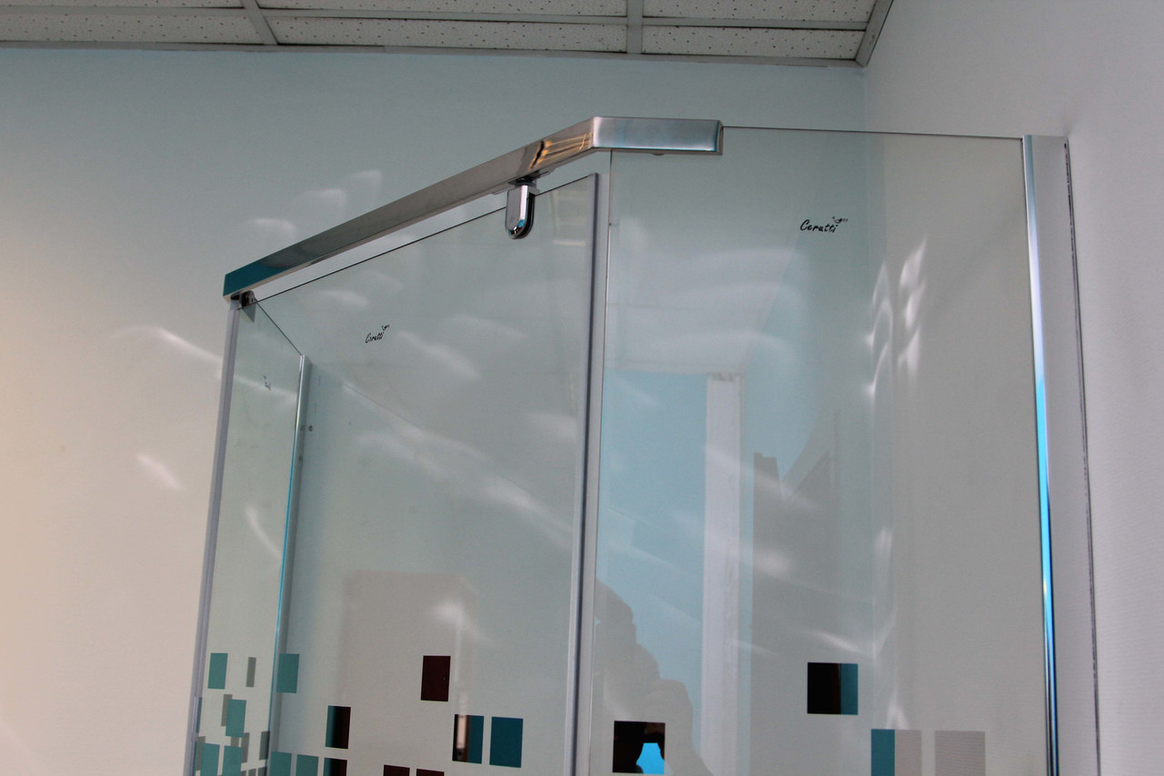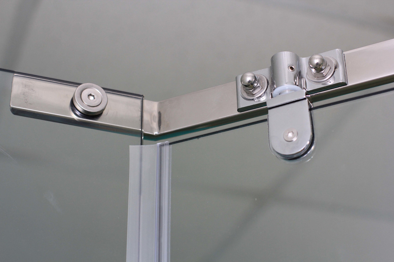 Достоинства: • Прозрачное закаленное стекло 6 мм с рисунком. безопасное и ударопрочное. В случае раскола оно рассыпается на куски без острых краев. • Ручка (30 см) и петли Acciaio puro &ndash. из чистой стали. На протяжении всего срока использования уголком элементы не теряют эстетику и не подвергаются коррозии. • Алюминиевый полированный хромированный профиль Cromato. • Право- и левосторонняя установка.