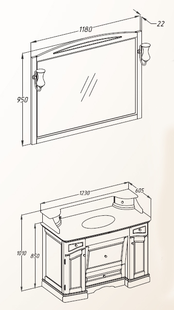 Комплектация: полка для зеркала (она же крышка для двух ящиков на столешнице).
