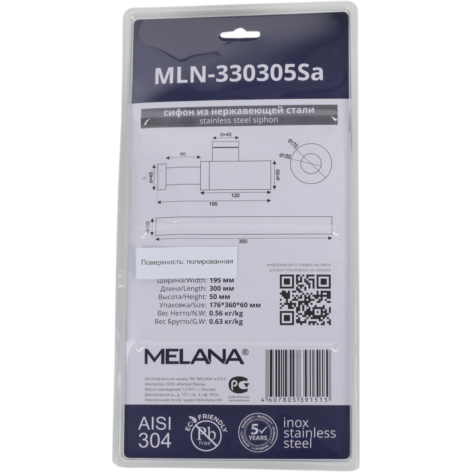 Сифон для раковины Melana нержавеющая сталь хром слив 45 мм - MLN-330305Sa