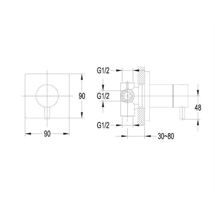 - положение «0»; - размеры розетки: 9x9 см; - минимальная глубина для установки: 4,5 см; - один вход смешанной воды: 1/2”; - три выхода смешанной воды: 1/2”; - элемент скрытого монтажа в комплекте.