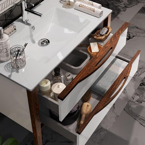 Коллекцию представляет подвесная тумба с двумя выдвижными ящиками с механизмом «плавное закрывание» и керамической раковиной.