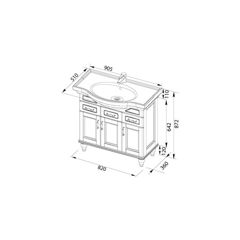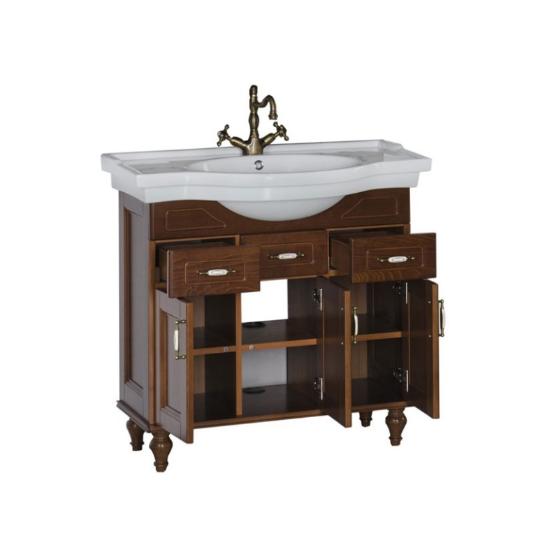 Теплый цвет и текстура натурального дерева воплощают мягкое очарование старины, придают гарнитуру дух аристократизма загородного дома. Нижняя часть тумбы украшена резными деталями, филенчатые дверцы повторяют орнамент рамочных боковин.