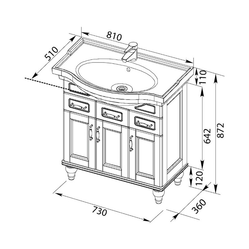 Теплый цвет и текстура натурального дерева воплощают мягкое очарование старины, придают гарнитуру дух аристократизма загородного дома. Нижняя часть тумбы украшена резными деталями, филенчатые дверцы повторяют орнамент рамочных боковин.
