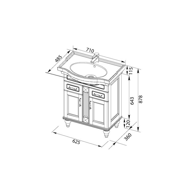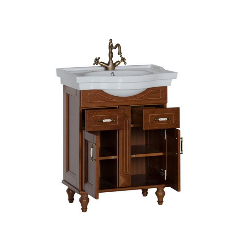 Теплый цвет и текстура натурального дерева воплощают мягкое очарование старины, придают гарнитуру дух аристократизма загородного дома. Нижняя часть тумбы украшена резными деталями, филенчатые дверцы повторяют орнамент рамочных боковин.
