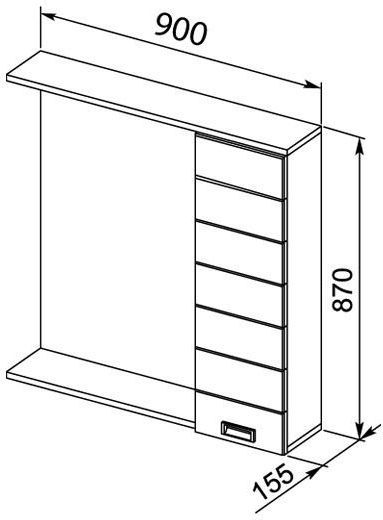 Зеркало с полкой имеет боковой шкафчик для банных принадлежностей и гигиенических средств, дверка которого украшена ритмичным горизонтальным декором.