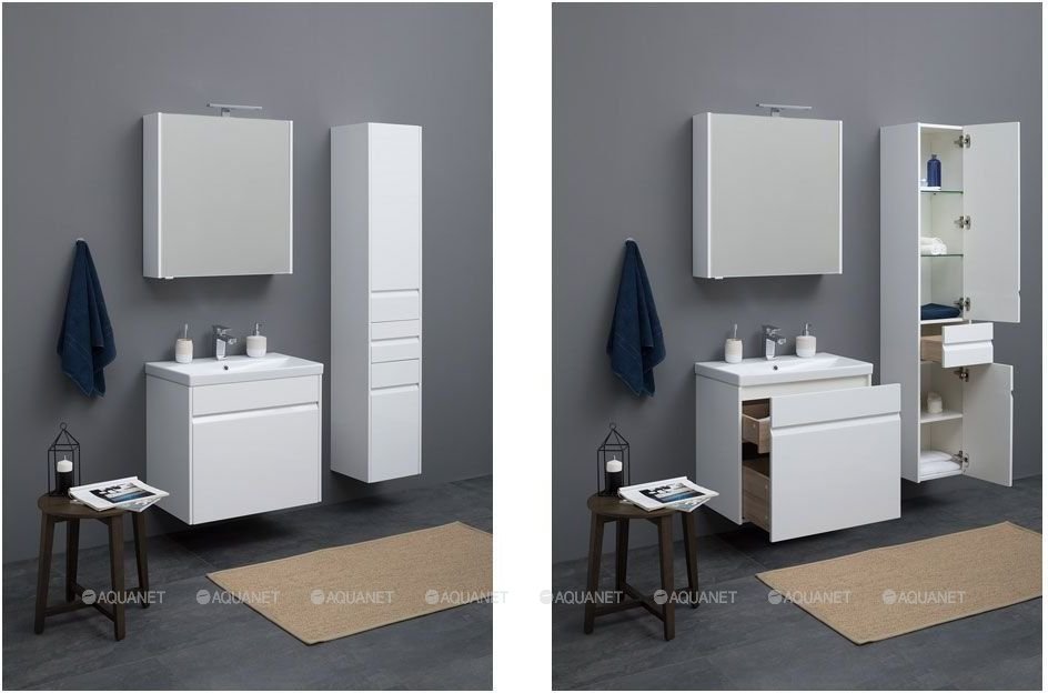 Шкаф-пенал для ванной Aquanet Палермо белого цвета шириной 35 см с корпусом из влагостойкого ЛДСП интересен в первую очередь игрой деталей. Так, полосы глубокой фрезеровки на фасаде - это вовсе не декоративные детали, как может показаться на первый взгляд, а удобные интегрированные ручки - модный мебельный тренд. Пенал разделен на три зоны хранения, соответственно, в нем предусмотрено три таких фрезеровки-ручки. Две из них открывают распашные дверцы, за которыми в общей сложности скрыты пять полок, и одна служит ручкой для расположенного посередине выдвижного ящика. Функционально, просто и красиво.