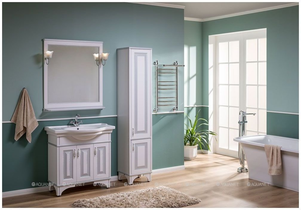 Растрескивание красочного слоя наделяет мебель духом благородного шарма, которая придает интерьеру помещения богемный, а вместе с тем и домашний, уютный вид. Зеркало прекрасно сочетается с белоснежной раковиной из санфаянса и пропорциями тумбы комплекта мебели Aquanet «Валенса», наполняя ванную комнату теплом и уютом.