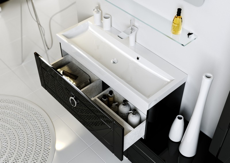 Подвесная тумба с одним ящиком в черном глянцевом с умывальником из литьевого мрамора