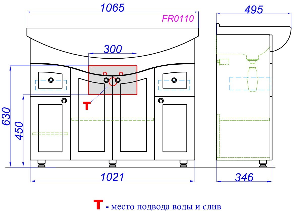 Напольная тумба с умывальником Стиль 1050 с четырьмя дверцами, два ящика для хранения мелочей.
