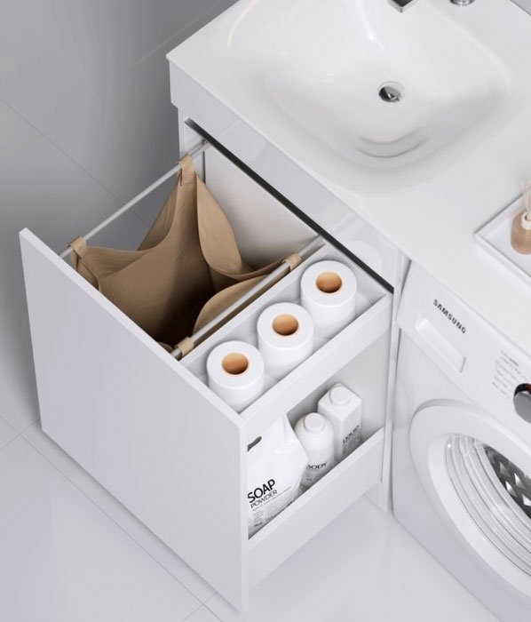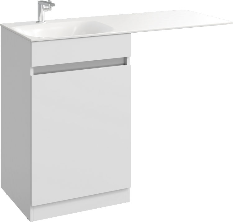 Напольная тумба c умывальником Forma 115,бельевая корзина слева и отсека для хранения хозяйственных принадлежностей.